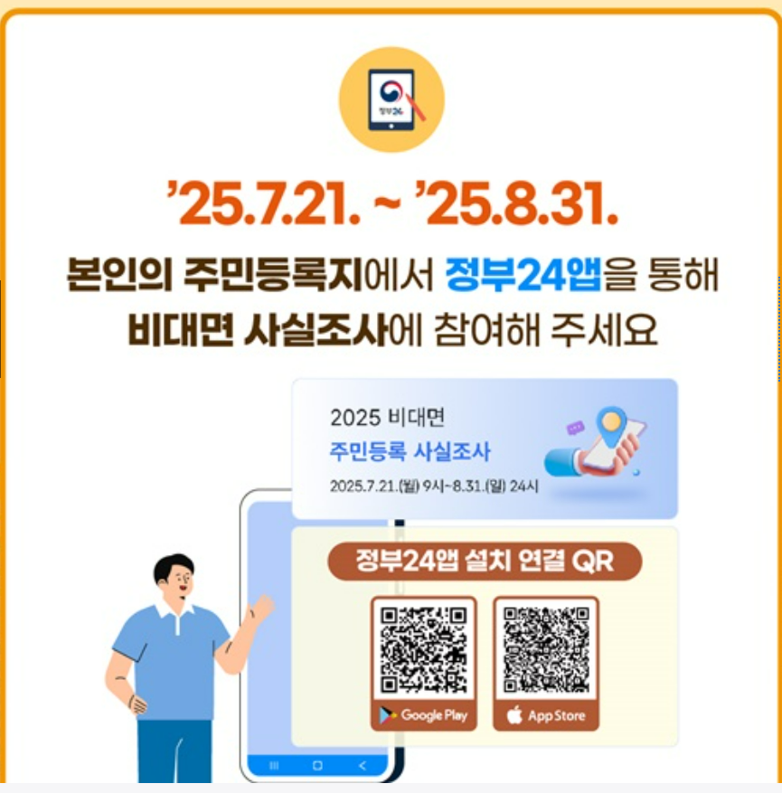 2025년에는 정부24 모바일 앱을 활용한 비대면 확인 방식이 도입되어, 빠르고 간편하게 주민등록 사실조사에 참여할 수 있게 되었습니다. 비대면 주민등록 사실조사가 필요하신 분들은 비대면 주민등록 사실조사 방법에 대해 지금 바로 확인해주시기 바랍니다.