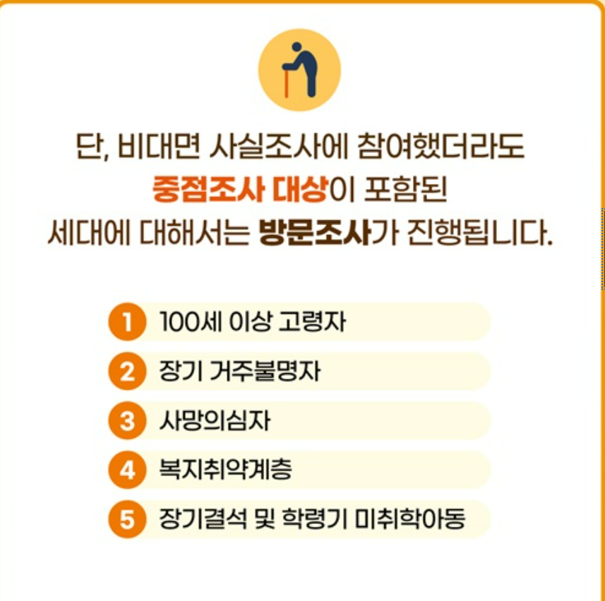 | 방문 조사 | 9월 1일(월) ~ 10월 23일(목) | 비대면 미참여 세대 및 중점 대상자 포함 세대 |